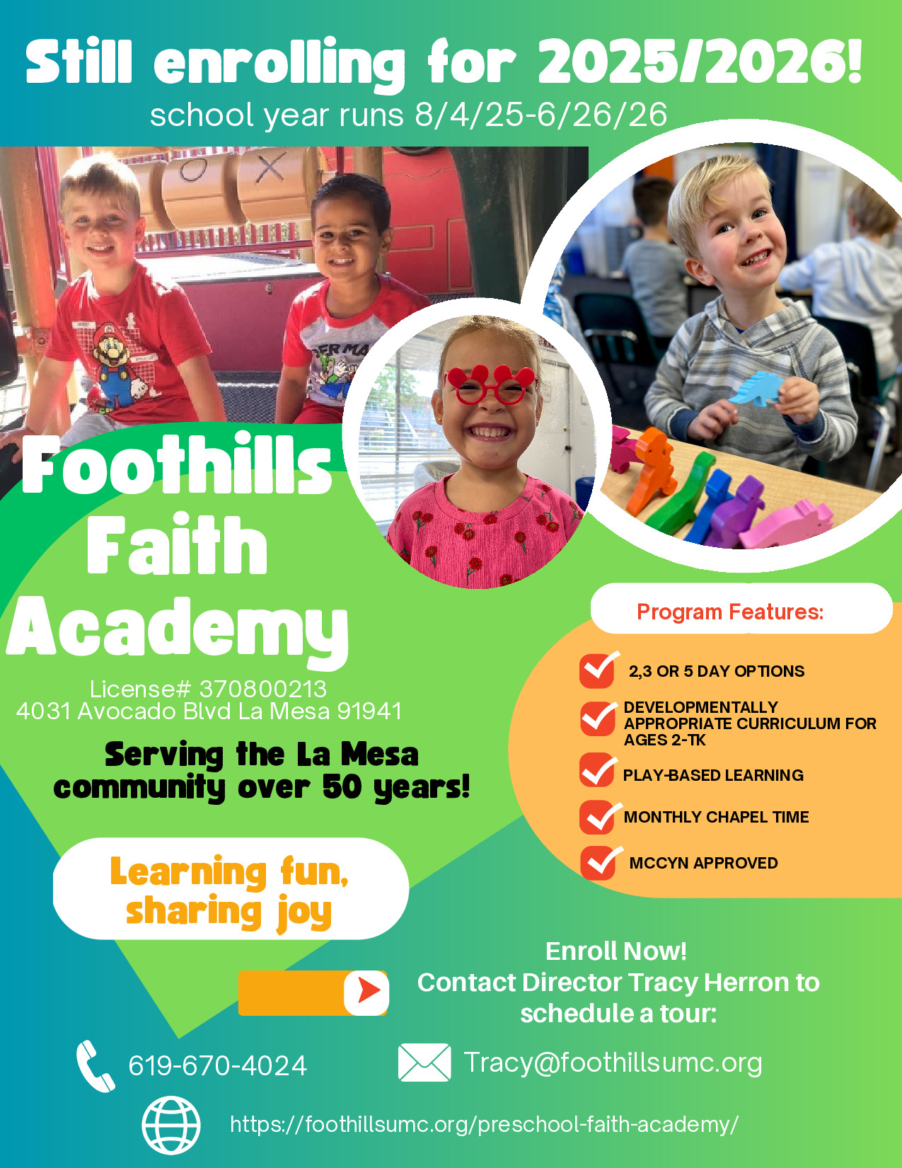 Contact director, Tracy Herron (Tracy@foothillsumc.org) for more information. Tuition and all preschool payments can be made through our website donate page.